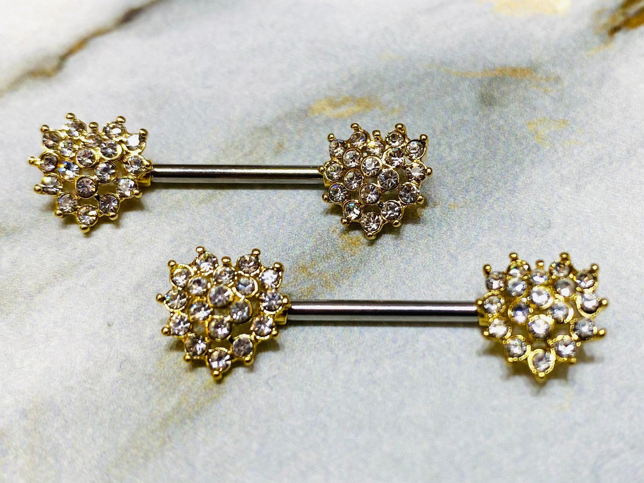 A set of 14g gold crystals paced hearts nipple barbells.