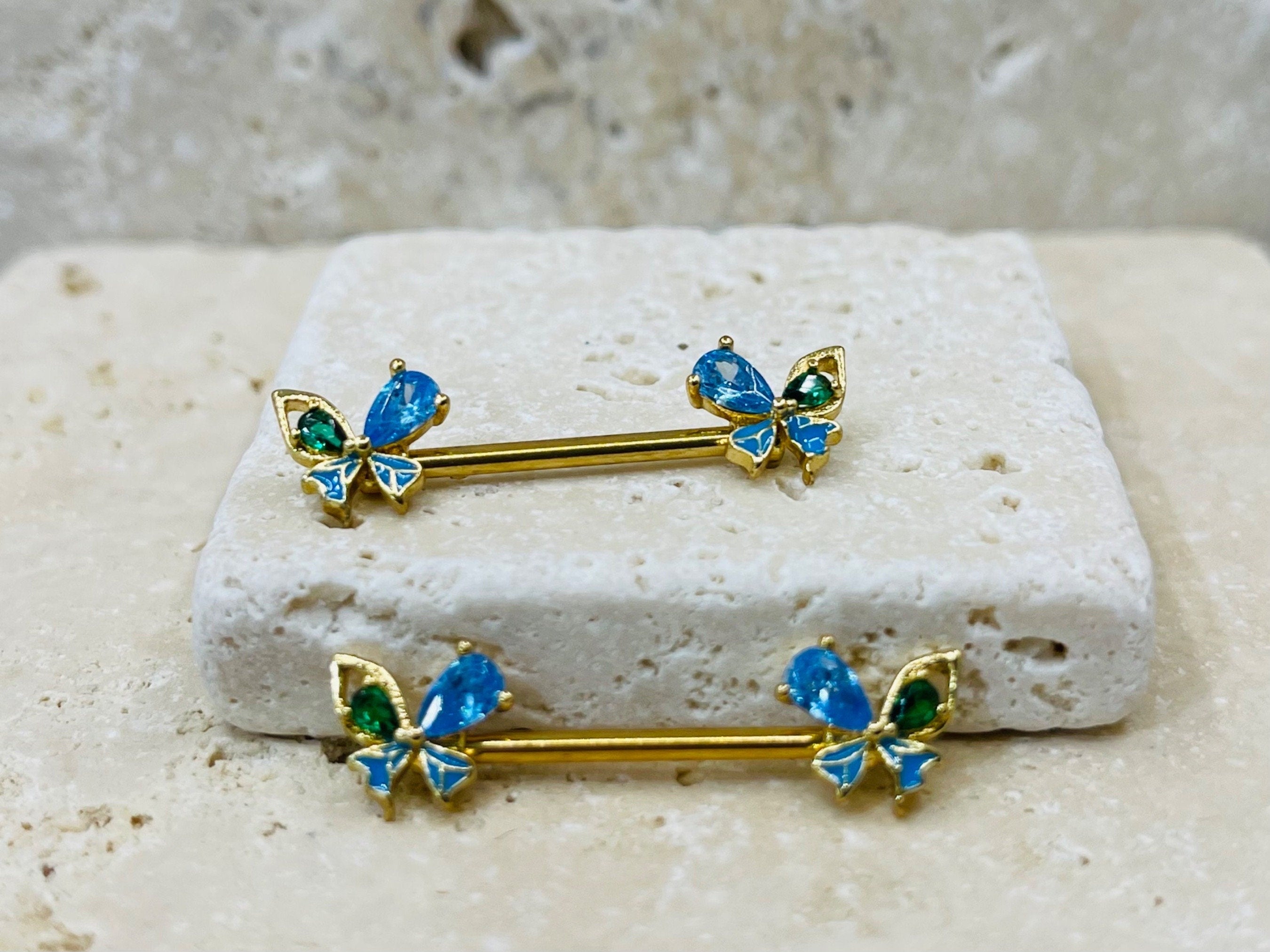 Pair of 14 gauge gold super dainty butterfly blue gem ends nipple piercing barbells.