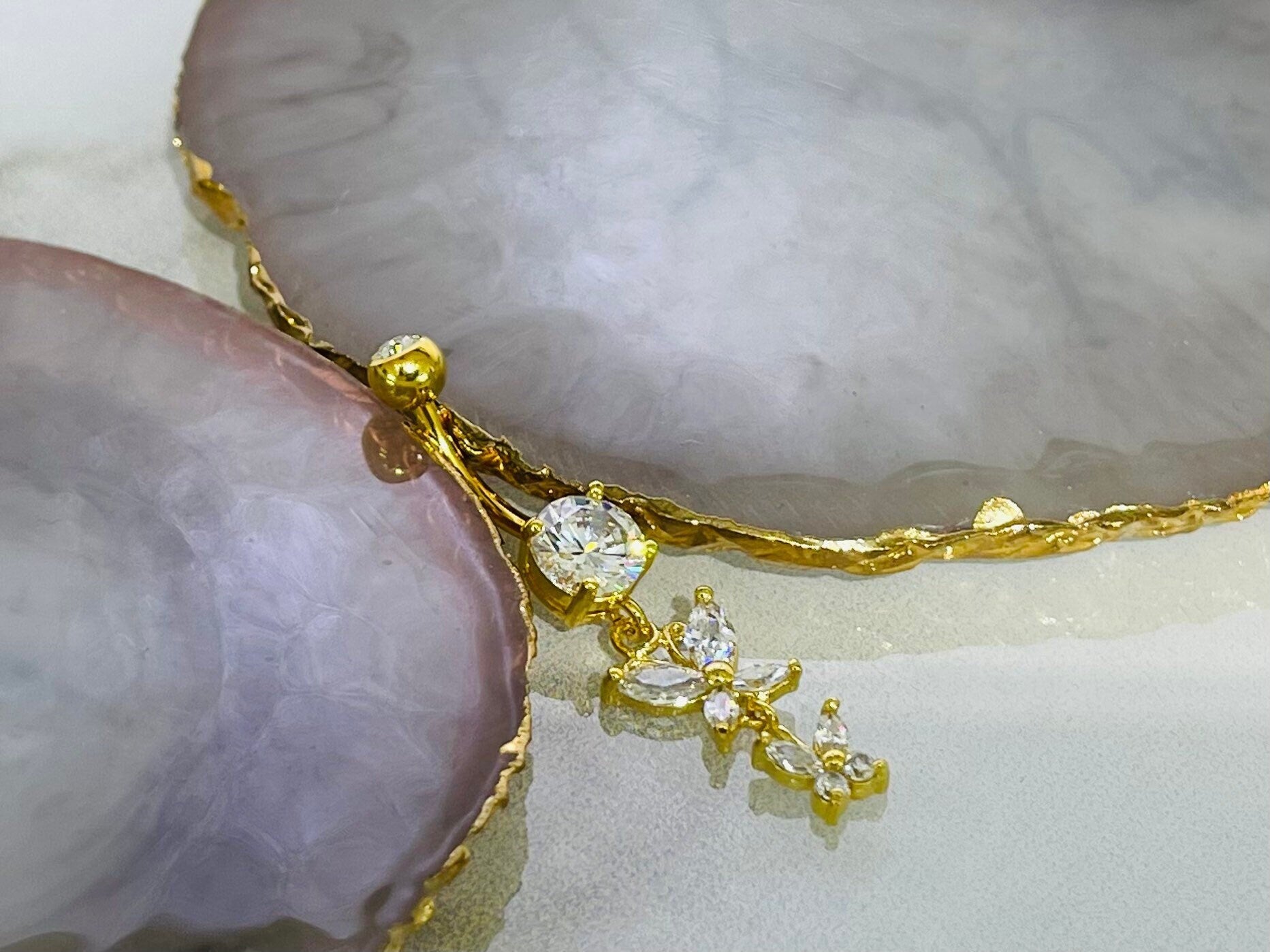 Dainty dangling butterflies with sparkling stones belly button piercing.