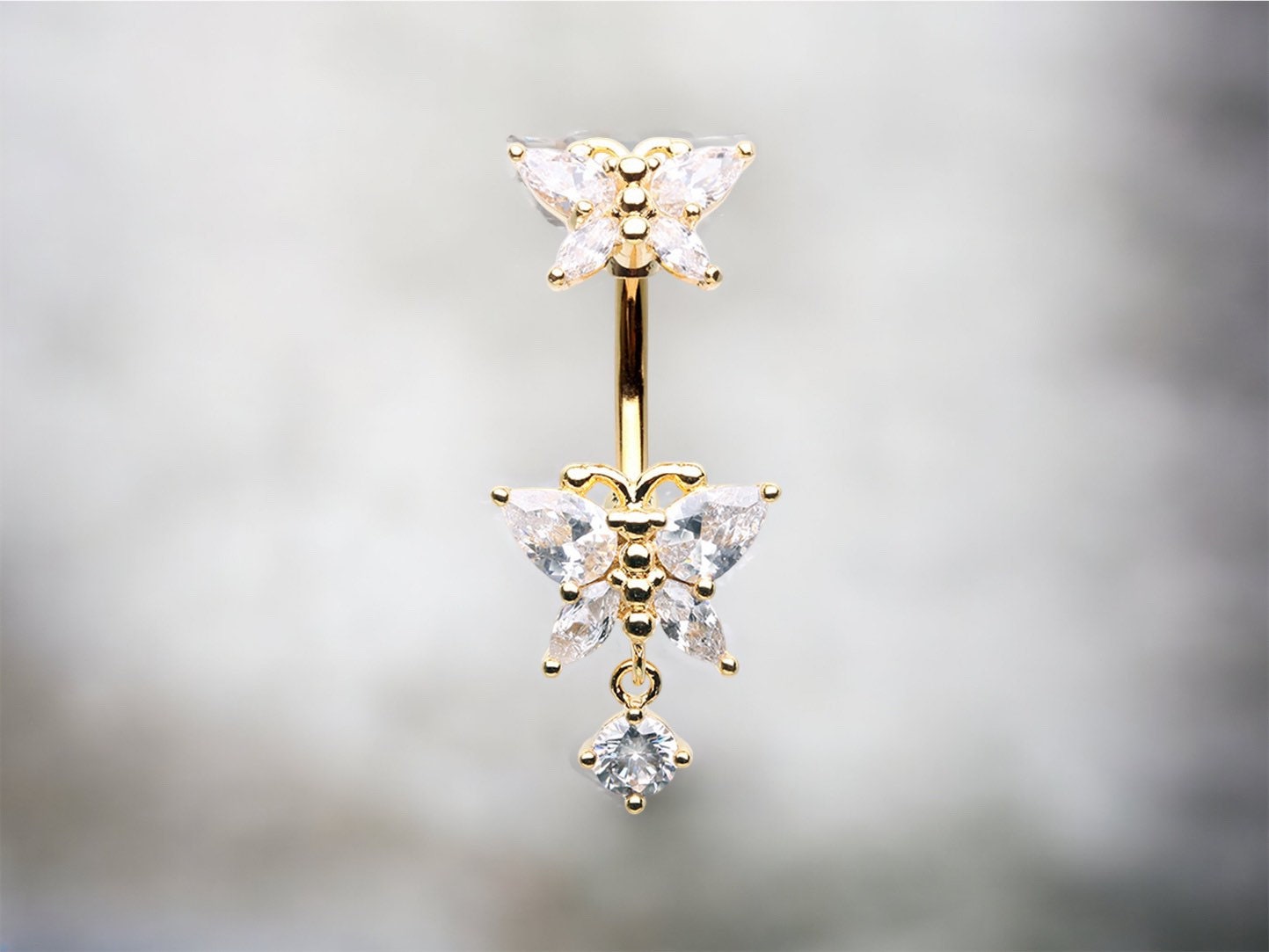Dainty double butterfly top and bottom with dangling clear gem belly button ring.