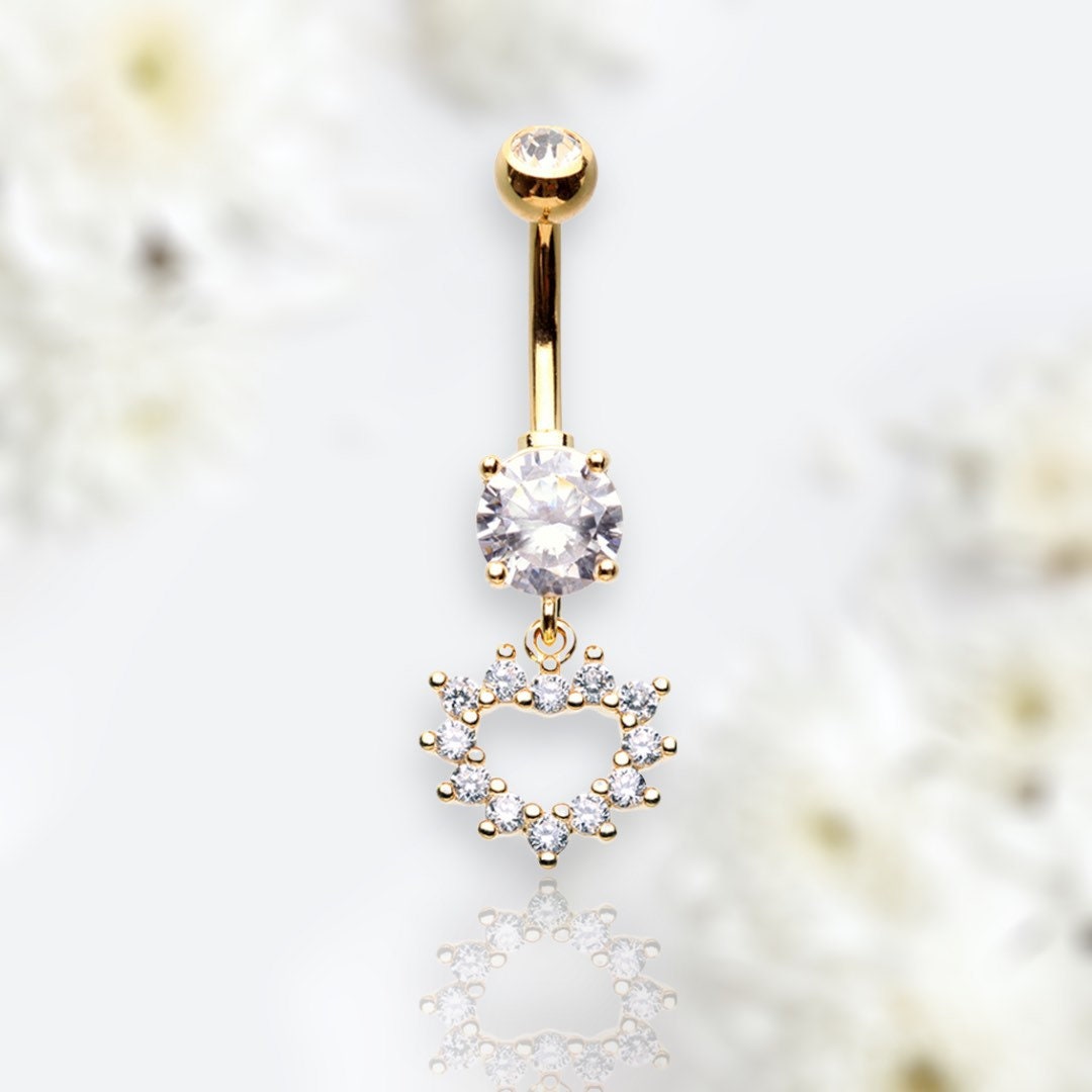 Dainty dangling heart outline with clear gems belly button ring.