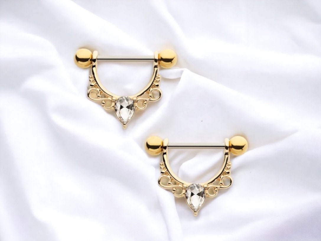 14 gauge gold pear shape center stone and filigree design dangling nipple barbells.