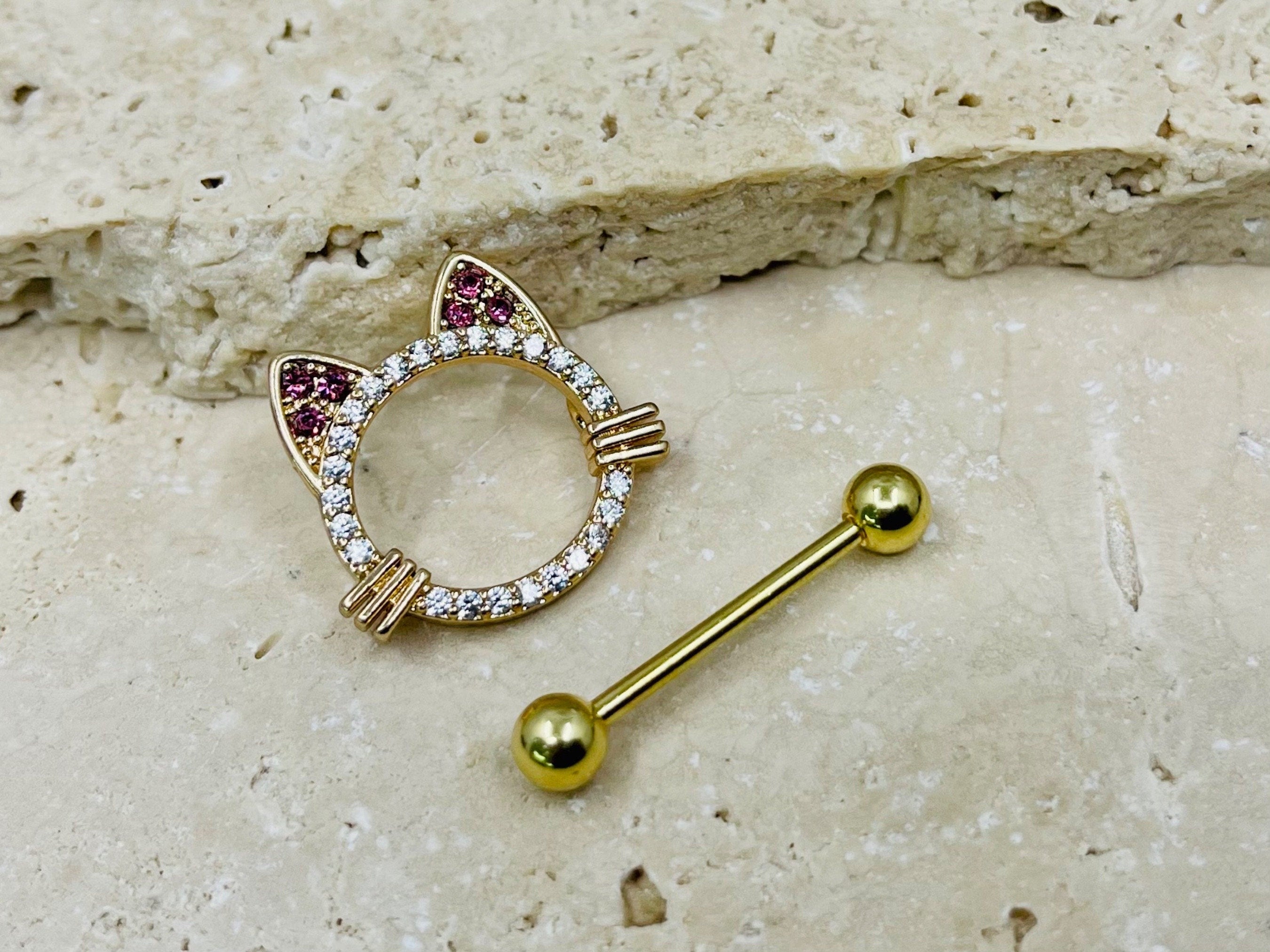 Pair of 14 gauge gold kitty cat with multi gems around nipple piercings barbells.