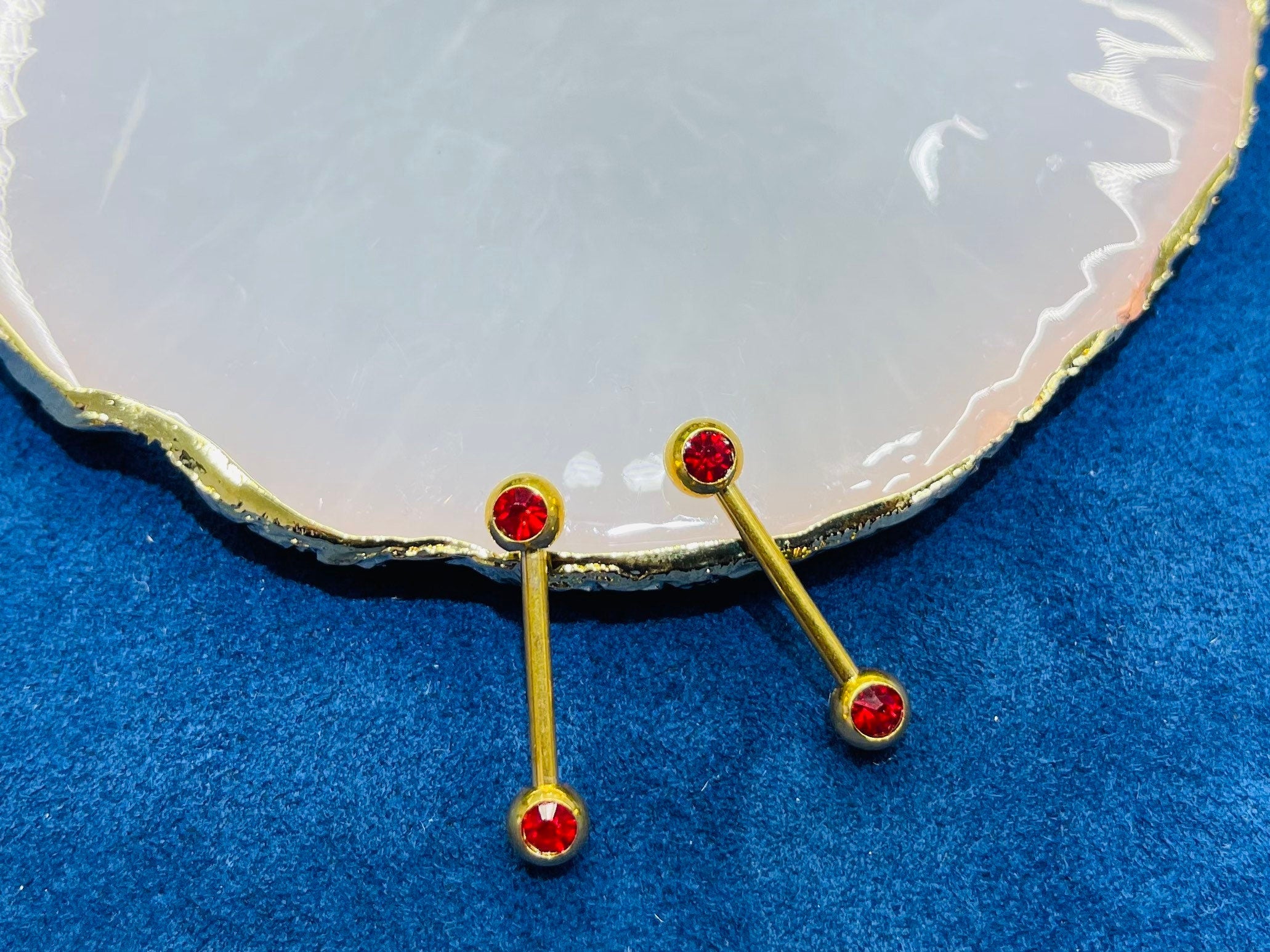 Set of 14 gauge gold front facing red gems nipple barbells.
