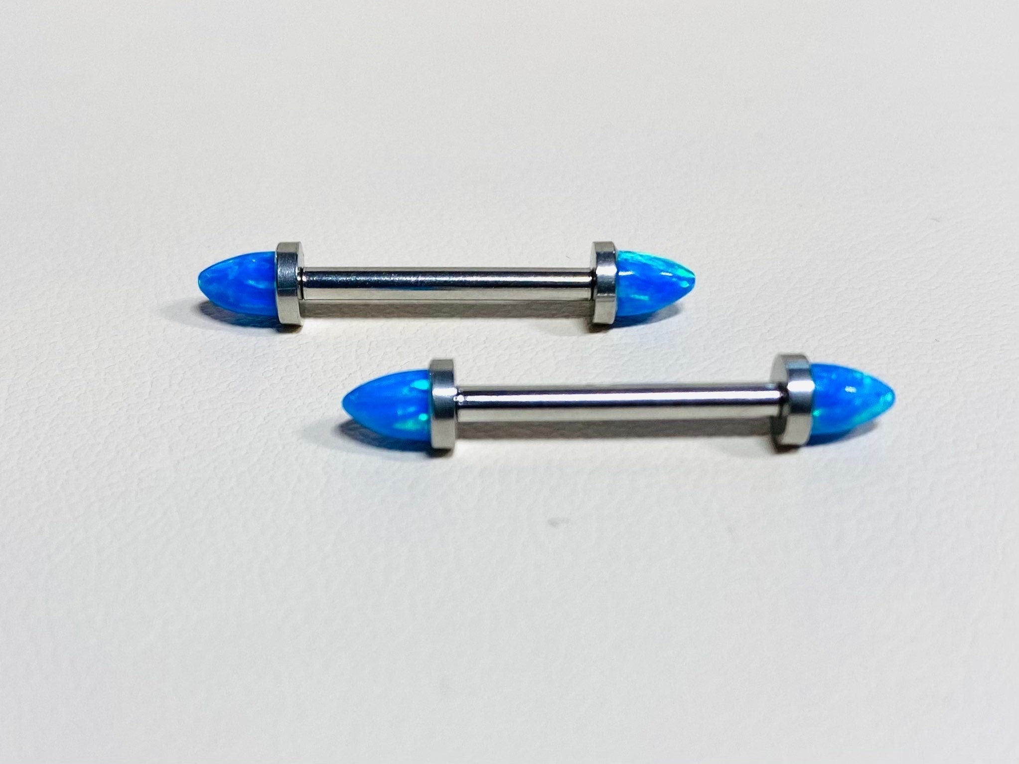 A set of implant grade titanium nipple barbells with blue opal ends.
