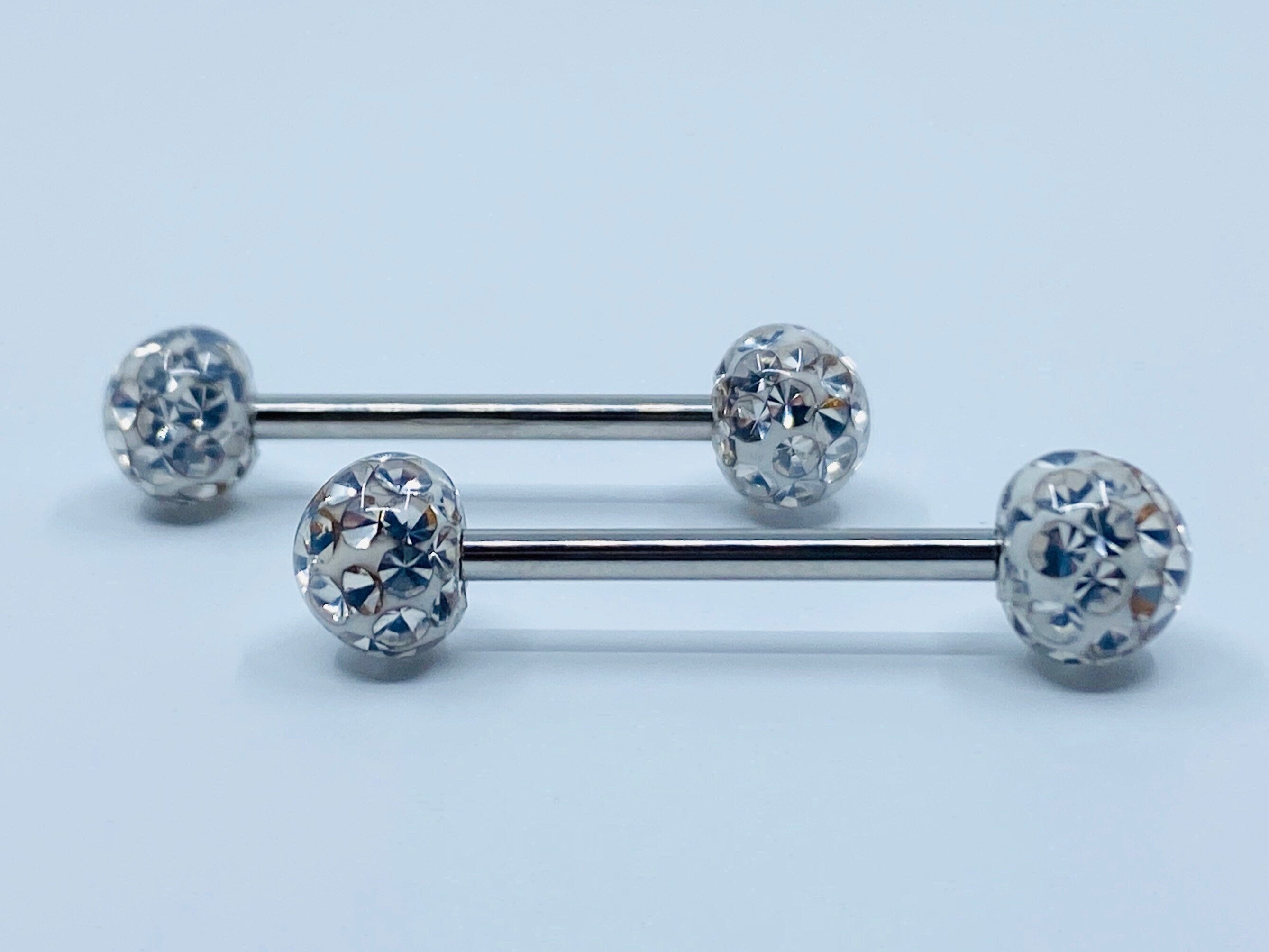 14G internally threaded crystal nipple barbells. Crystals are covered with epoxy coating to prevent discolor and stones falling off.