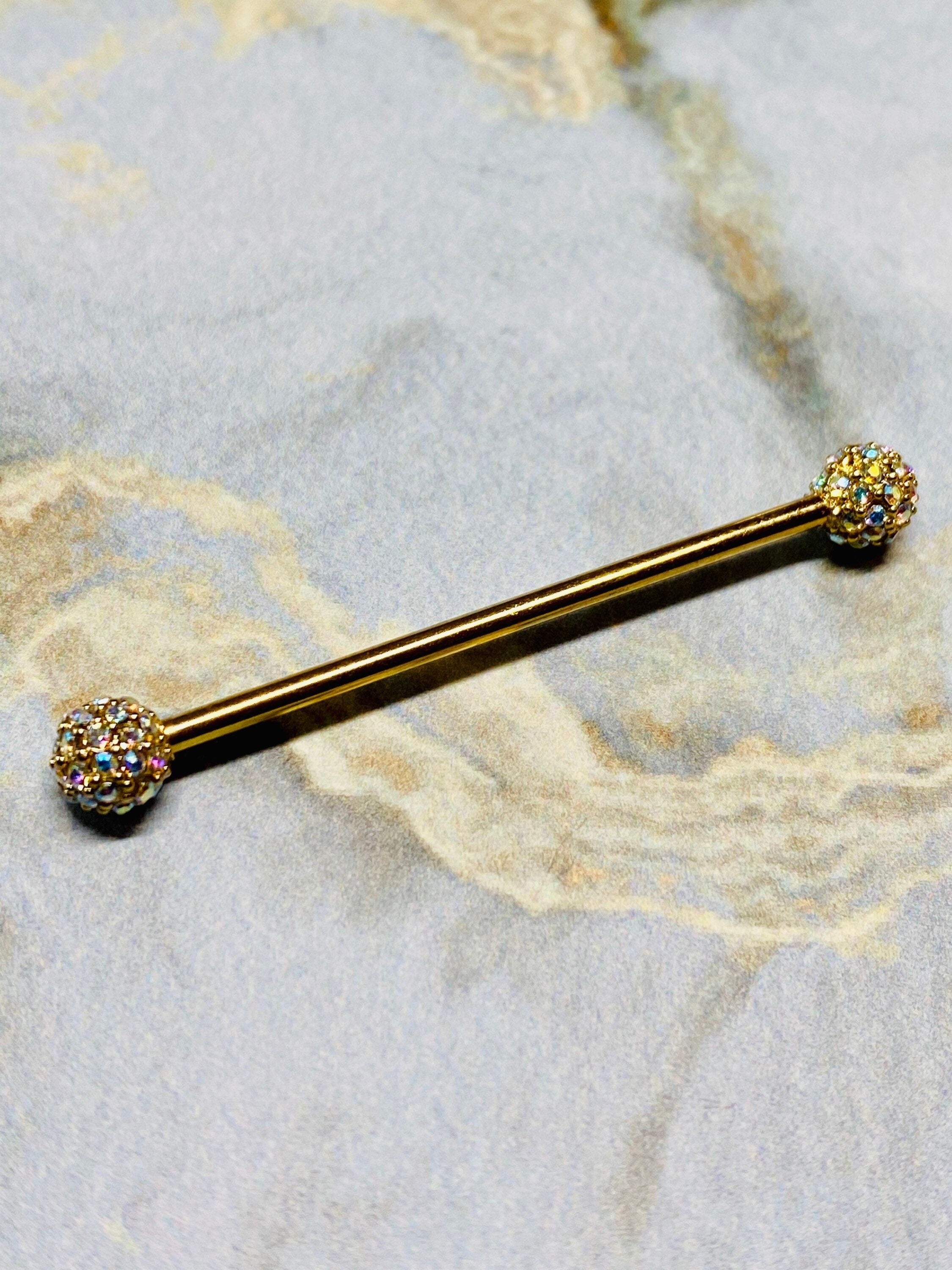 14G full aurora borealis cluster diamonds balls industrial barbell. Simple and sparkling.
