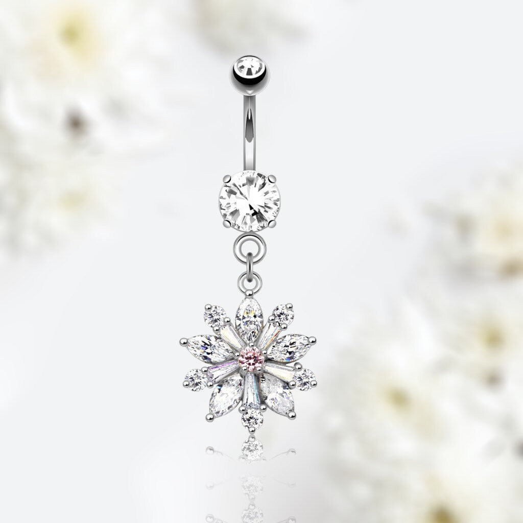 Dangling sparkling flower with clear stones and pink center stone belly button ring.