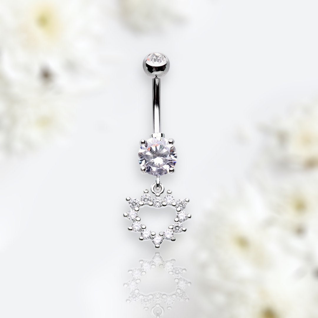Dainty dangling heart outline with clear gems belly button ring.