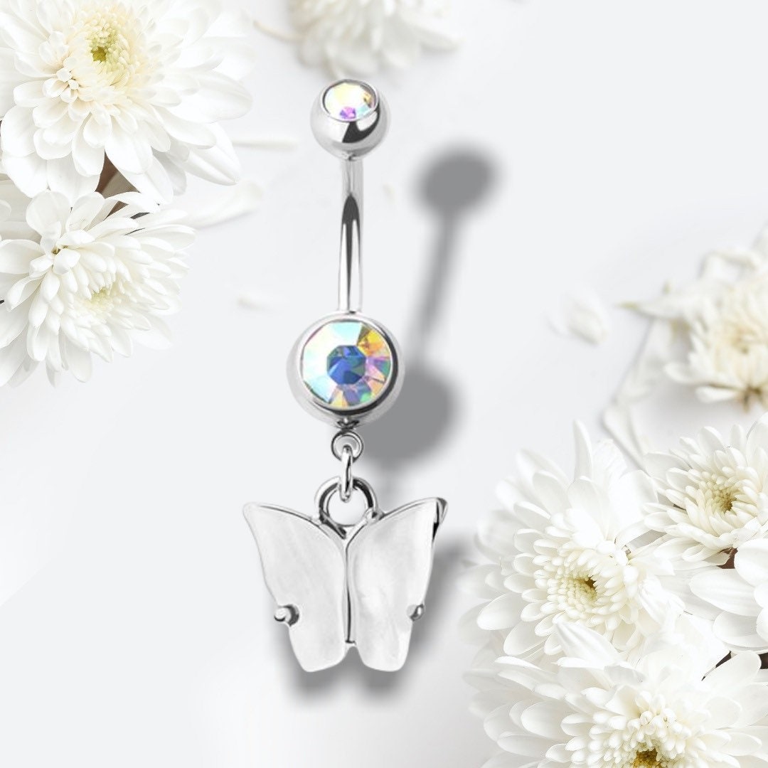 Cute and dainty white acrylic butterfly with multicolored gems belly button ring.