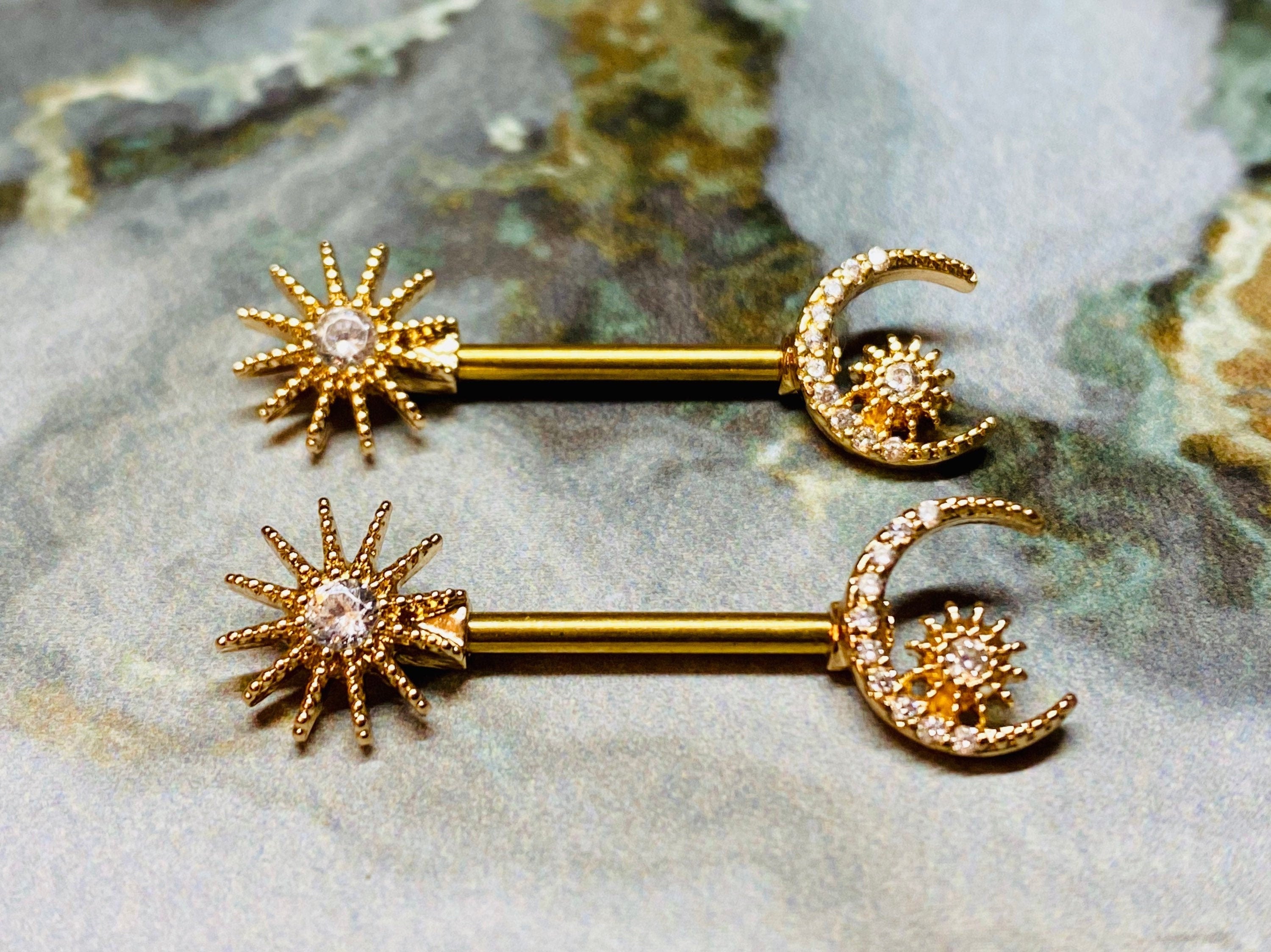 Set of center stone sun and stone paved crescent moon nipple barbells.