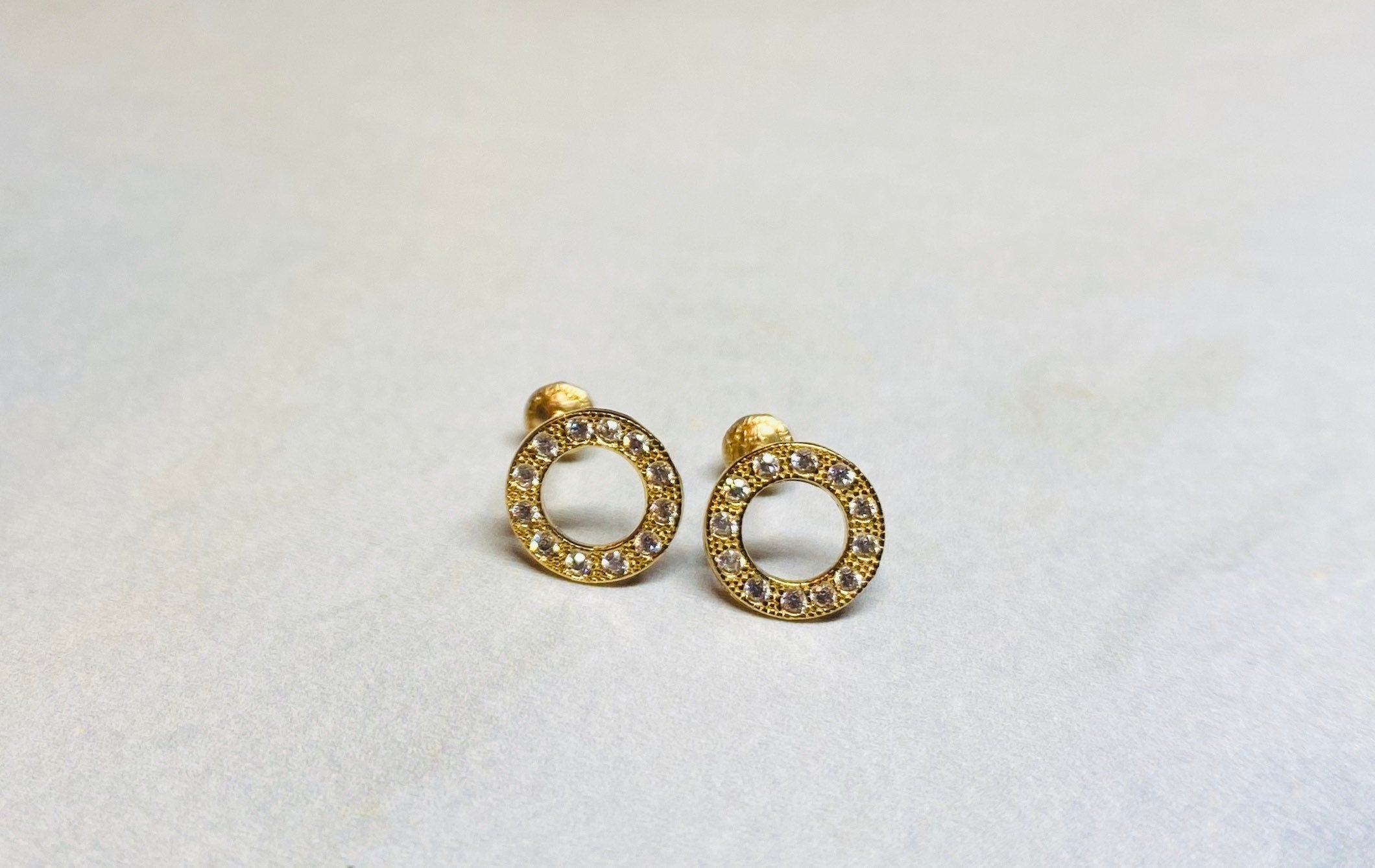 Set of dainty 14k gold circle earrings with screw backs.