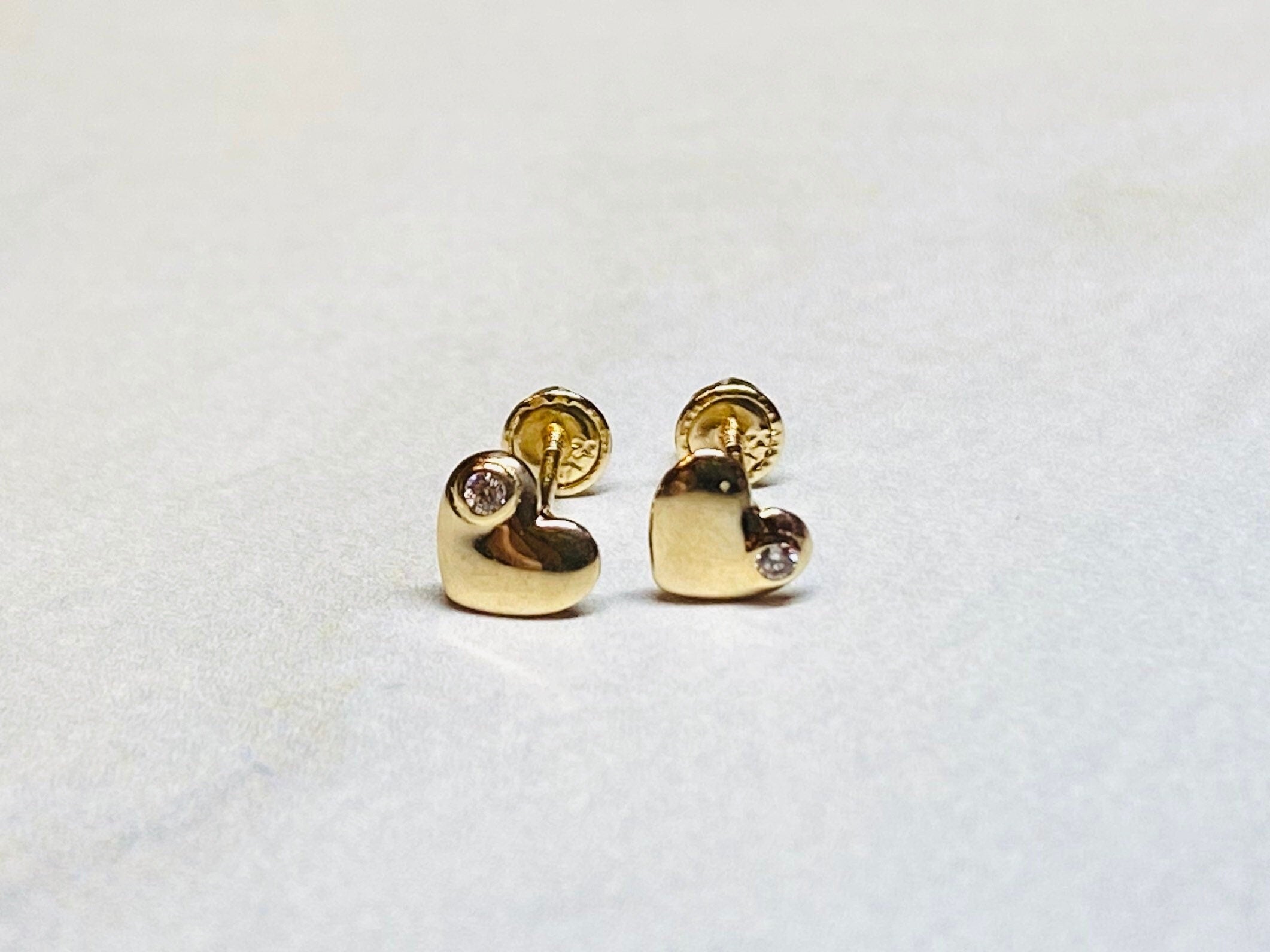 Set of dainty plain 14K gold heart screw back earrings with single small stone.