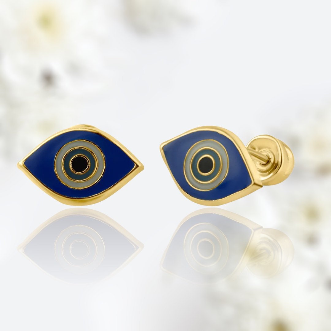 Set of 14 karat gold evil eye earrings with screw on backs. Suitable for all ages.