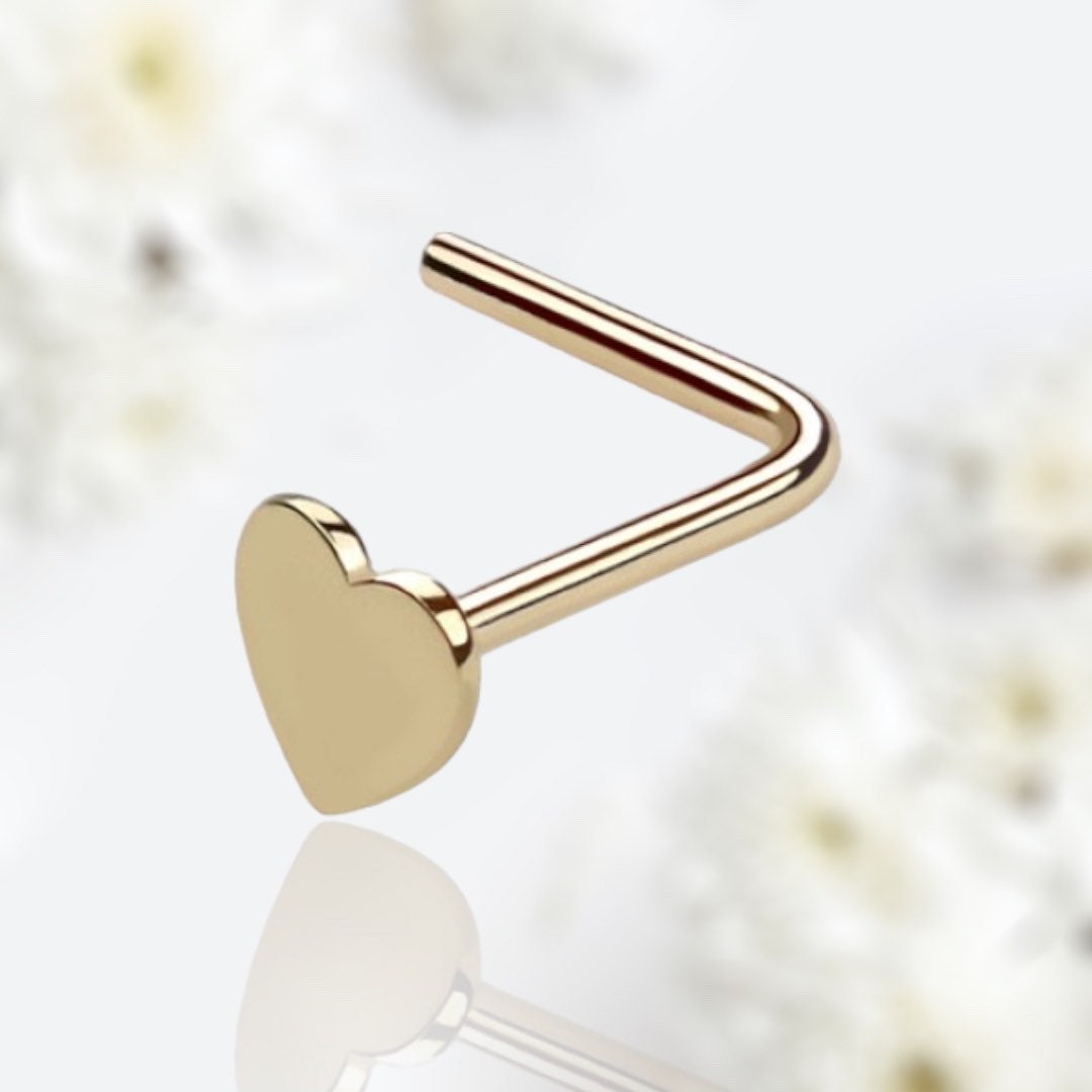 Dainty 14K yellow gold heart shape L shape nose stud.