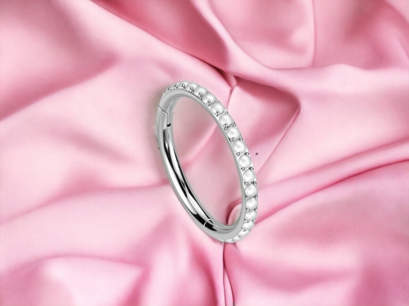 Super dainty silver front facing white pearls hinged clicker ring that is available in 8mm and 10mm.