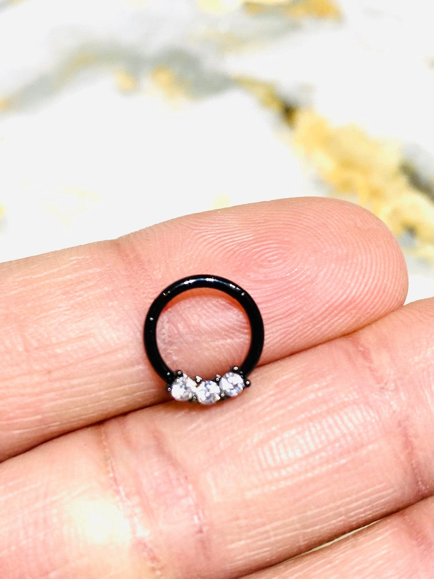 16g black hinged septum clicker ring with front facing 3 clear gems.