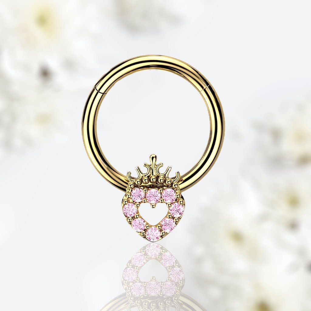 Dainty and adorable front facing heart with pink stones hinged septum clicker ring.