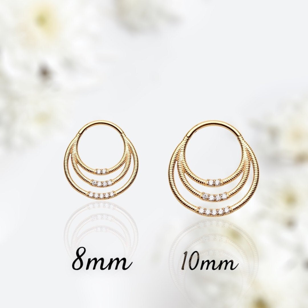 16g gold front facing triple row multi gems septum clicker ring.
