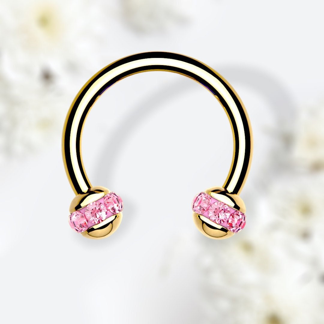 16G gold 8MM pink crystal balls horseshoe suitable for Daith, cartilage, eyebrow & septum piercings.All items are packaged nicely and ready to gift.