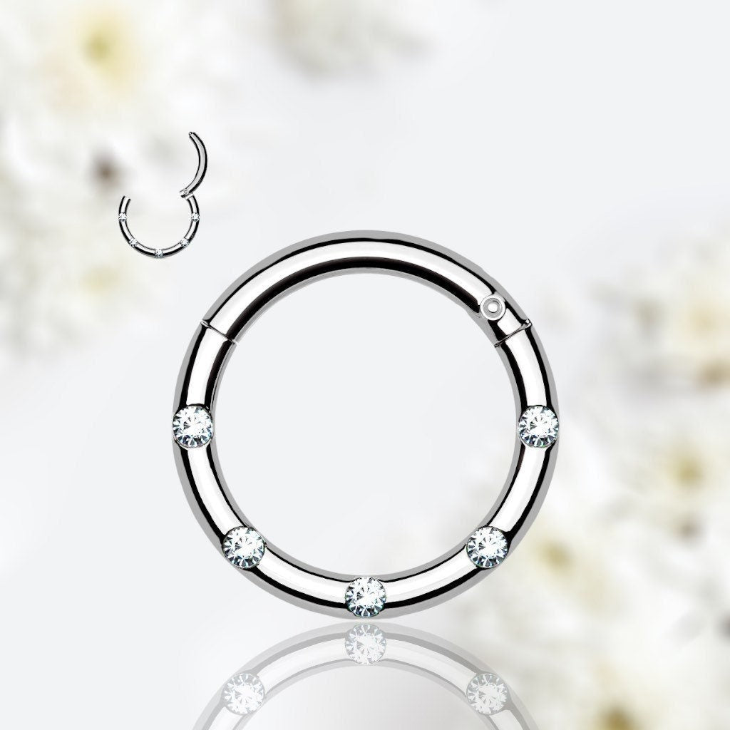 Cute and minimal round septum clicker ring with five front facing clear stones.