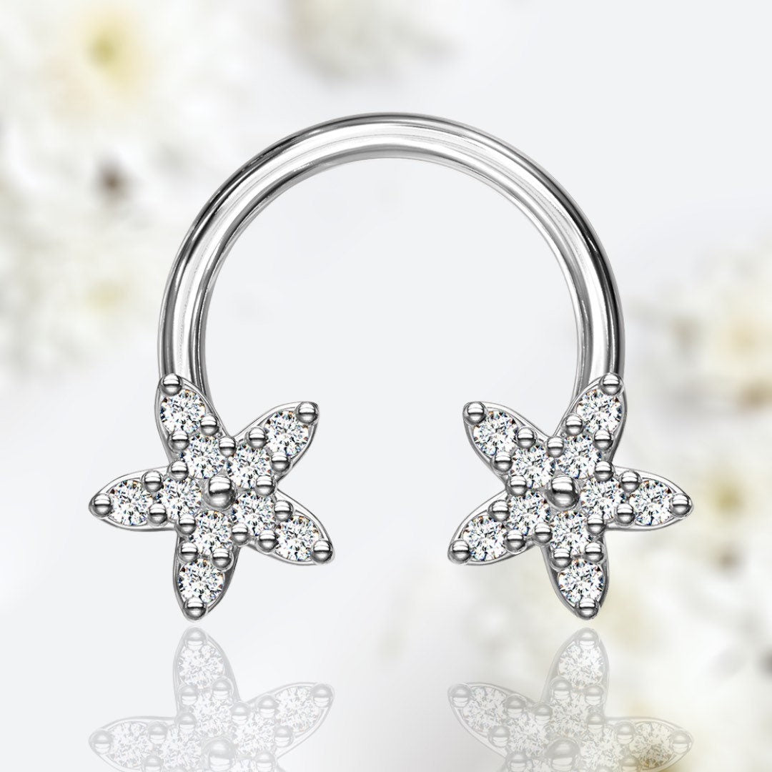 Adorable clear stone flower ends on 8MM circular horseshoe for septum, cartilage and tragus piercings.All items are packaged nicely and ready to gift.