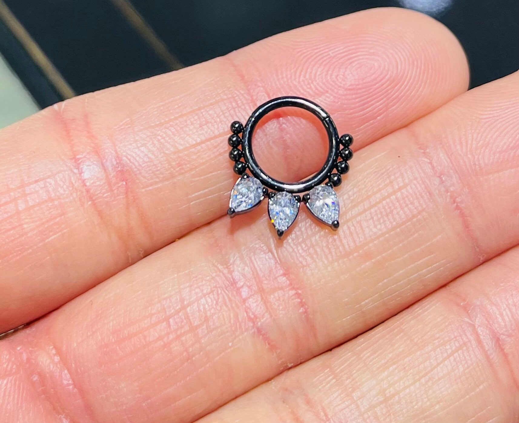 16G Surgical Steel Black Pear Shape Beaded Hinged Clicker Ring for Septum, Daith & More