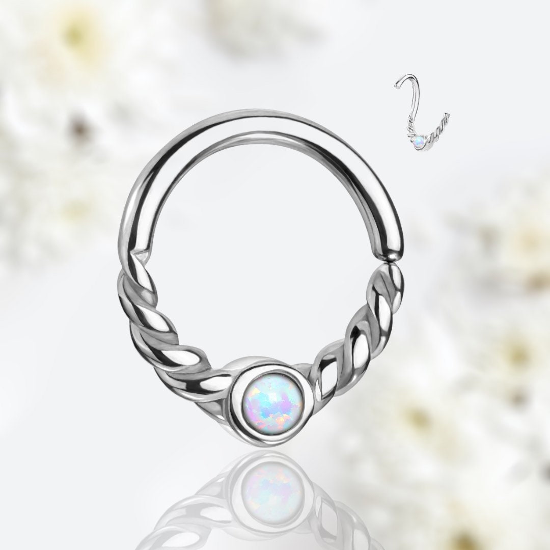 Dainty bendable 8MM hoop with white opal stone. Suitable for tragus, daith, cartilage, septum.