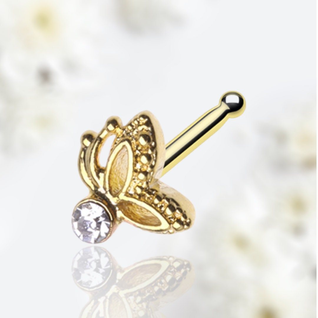 20G Gold Sparkling Clear Gem Flutter Butterfly Nose Stud