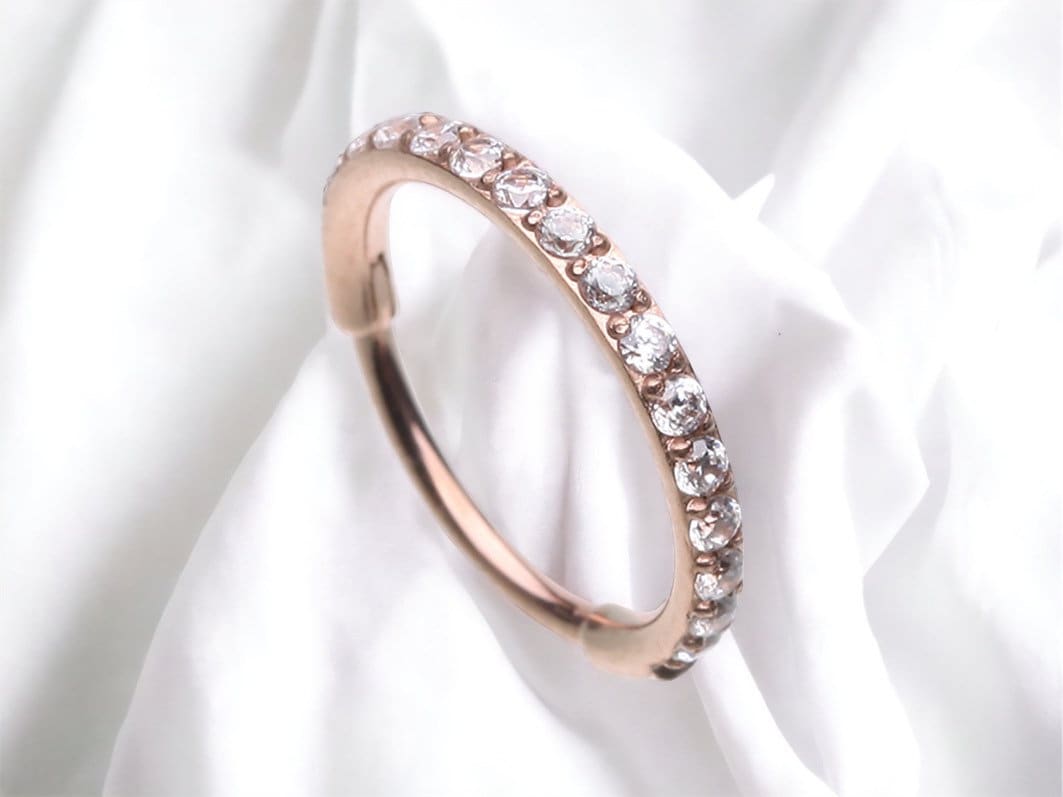 20G super dainty rose gold nose hoop with front facing stones. Insert and click to fit in place. No bending required.