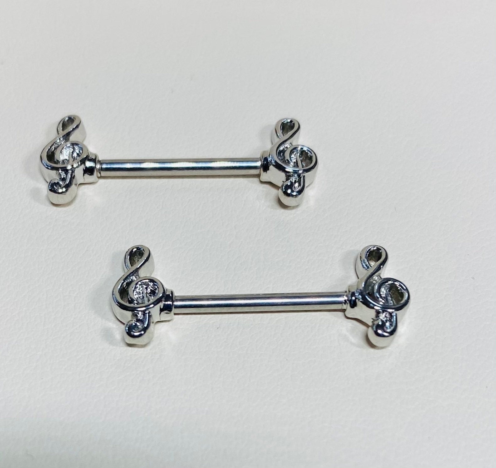 A set of treble music note with clear stone nipple barbells.