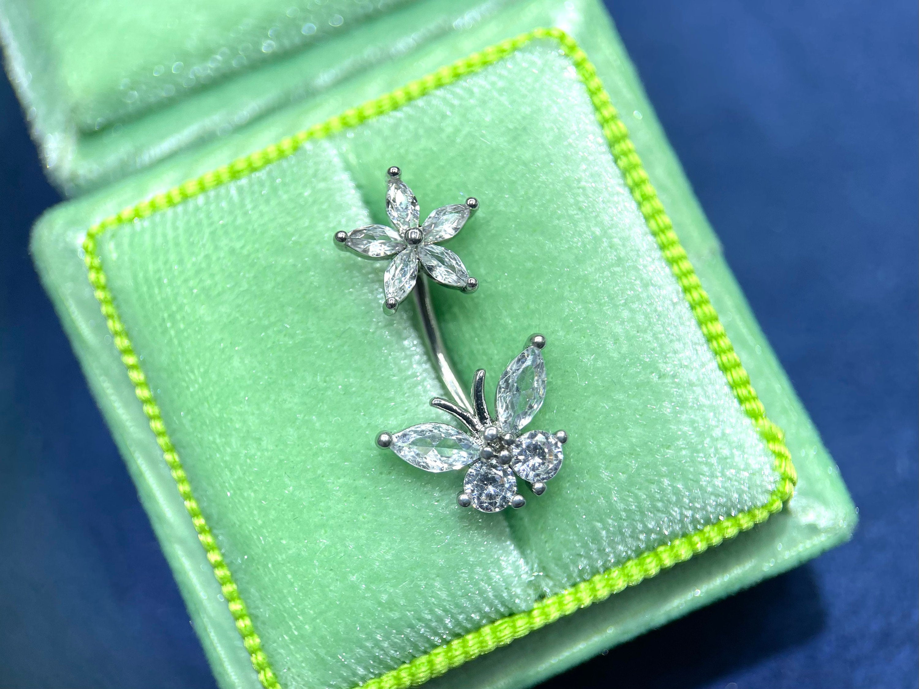 Dainty and cute belly button ring with white gem flower top and butterly ay the bottom.