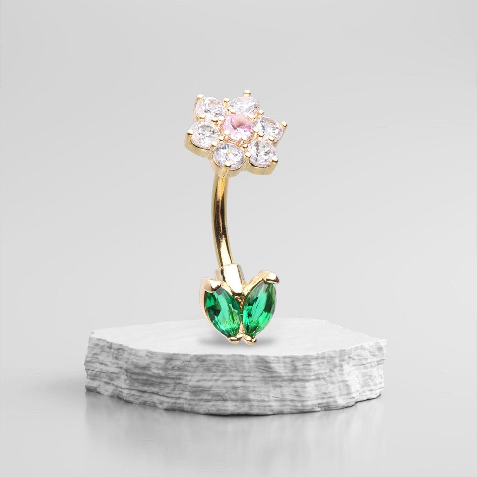 Dainty gold blooming flower belly button ring with clear and pink gem flower top. Perfect for everyday wear.