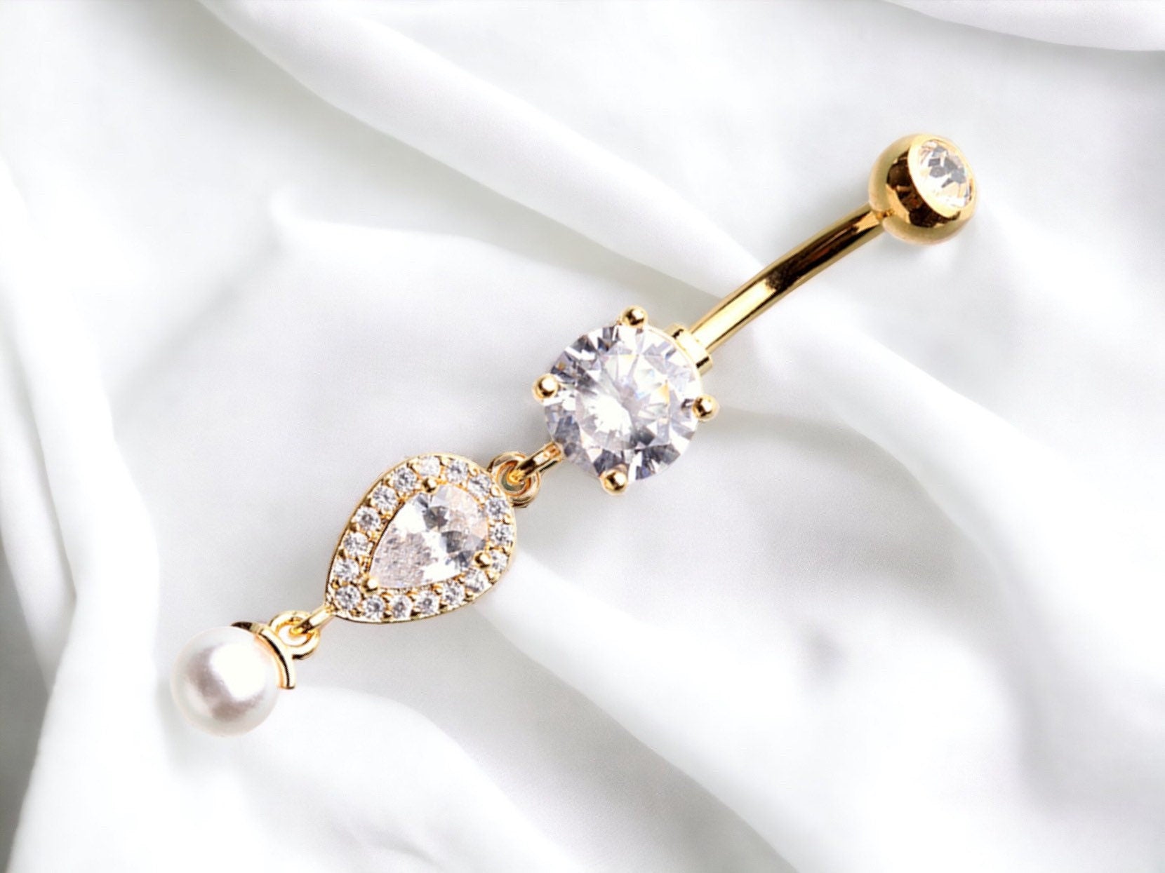 Dainty and adorable teardrop gem with white dangling pearl belly button ring.