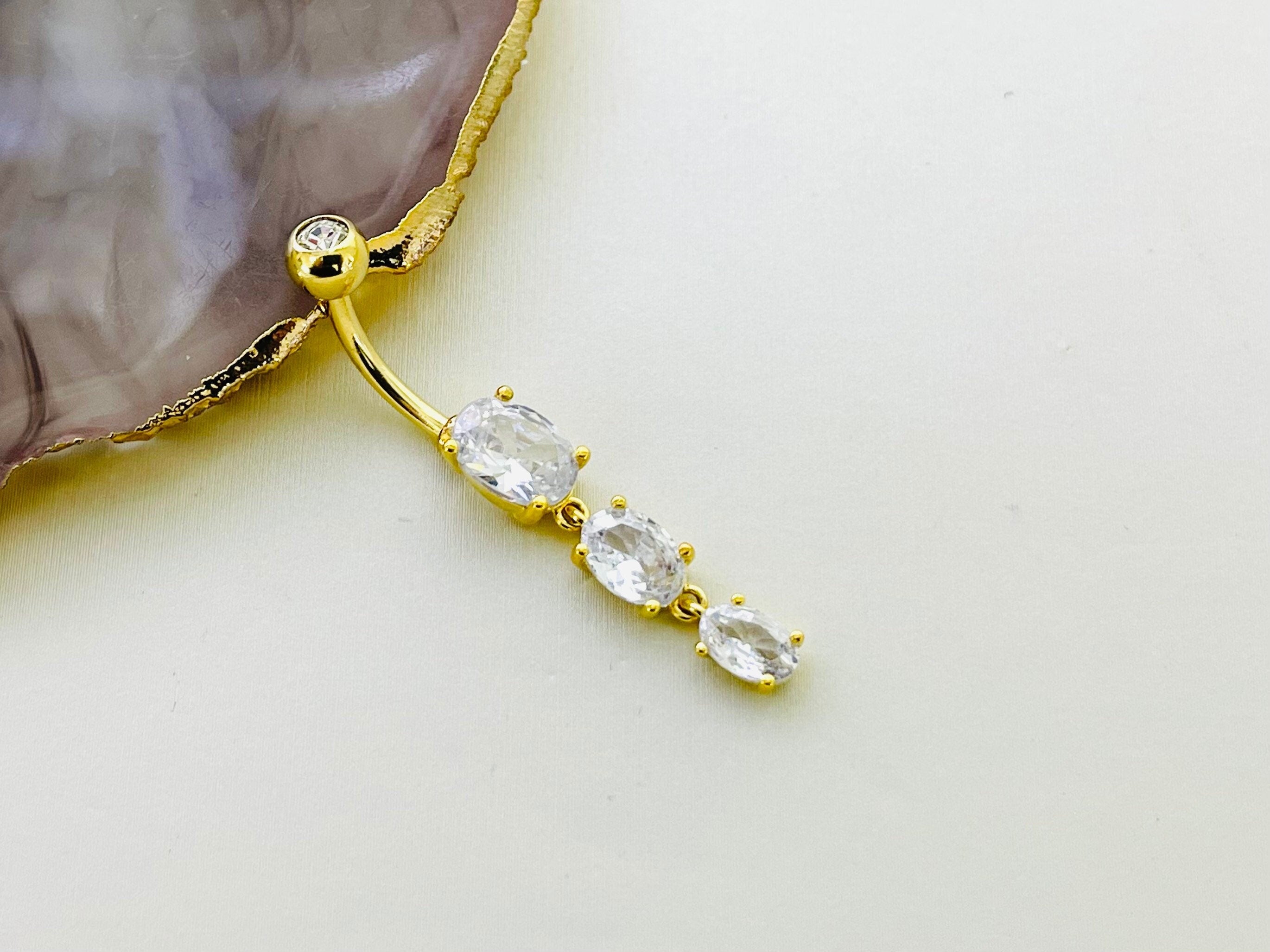 Dainty Gold Triple Oval Gem Dangling Belly Button Ring