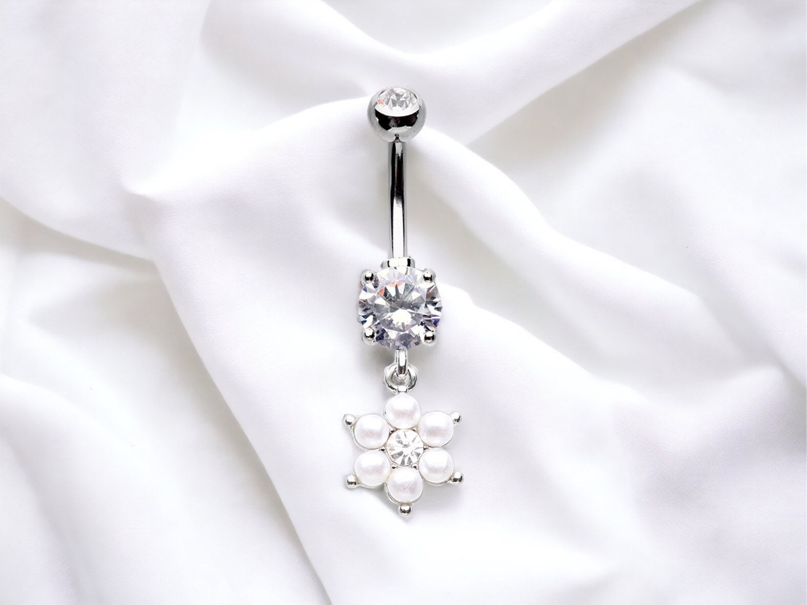 Fresh water cultured white pearls dangling belly button ring.