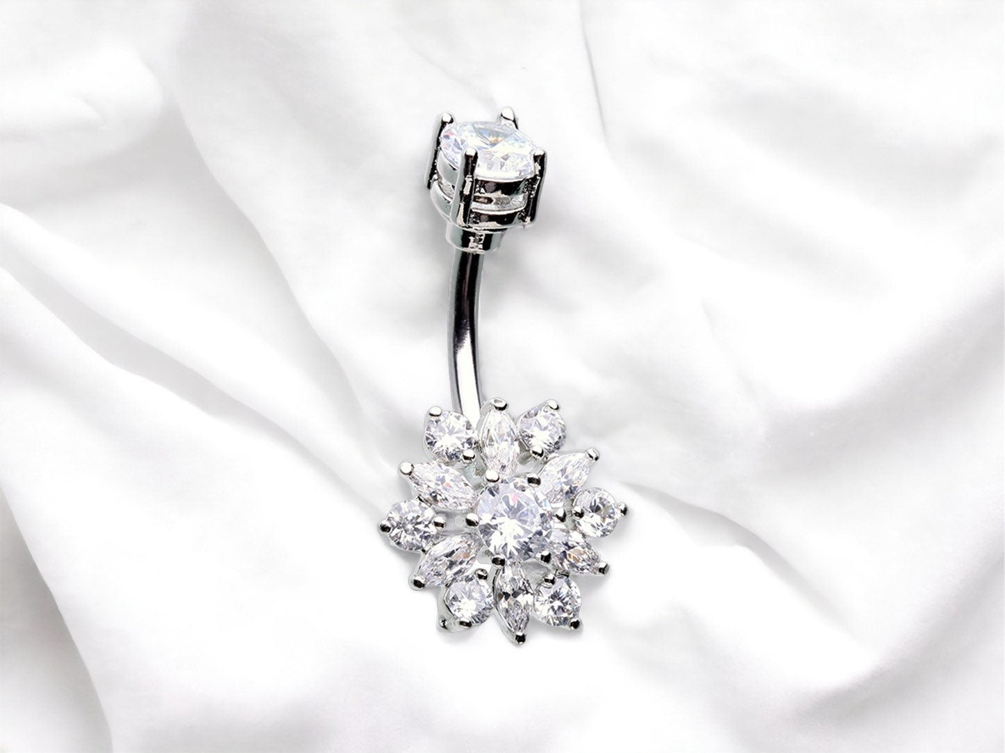 Dainty sunburst design belly button ring with clear gems.