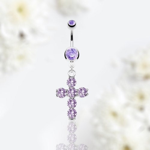14g dangling cross belly button ring with purple stones.