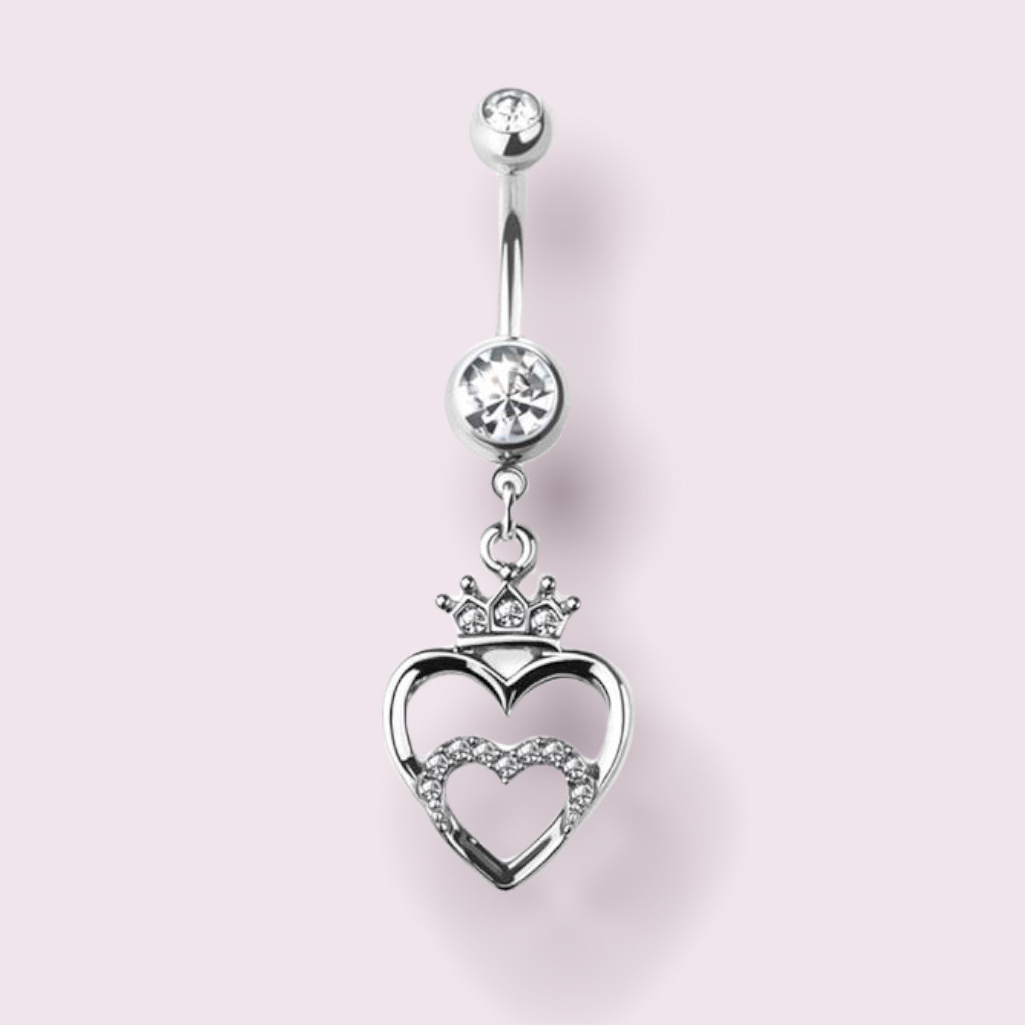 14G gold belly button ring with dangling heart and crown.