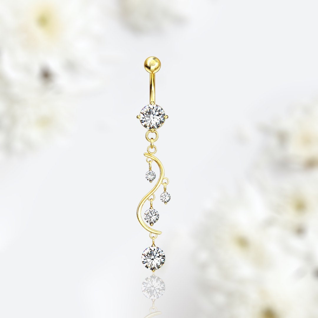 Gold Dangling Clear Solitaire Gems Belly Button Ring