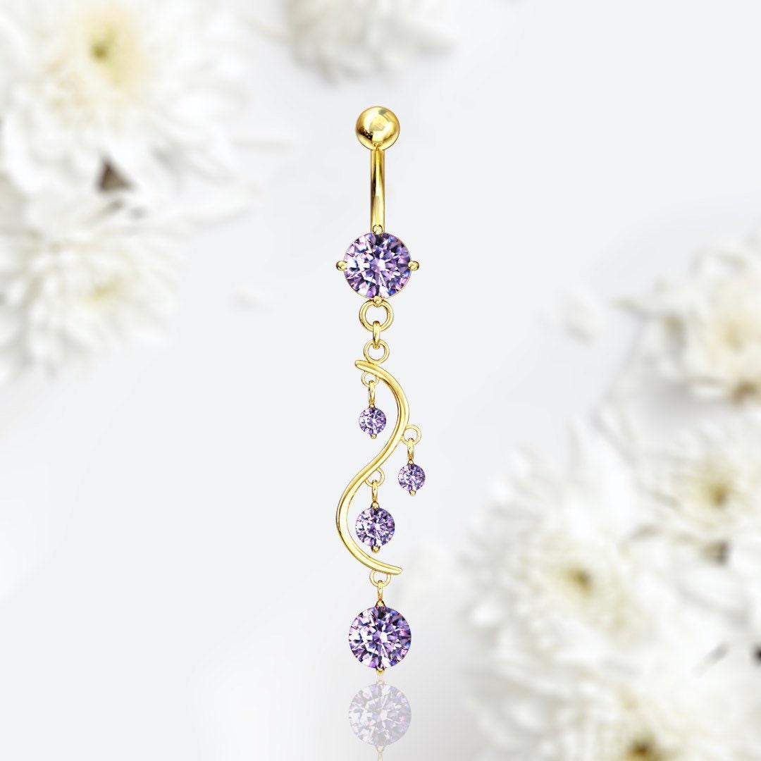 Gold Dangling Purple Solitaire Gems Belly Button Ring, Dangle Belly Button Ring, Belly Button Piercing