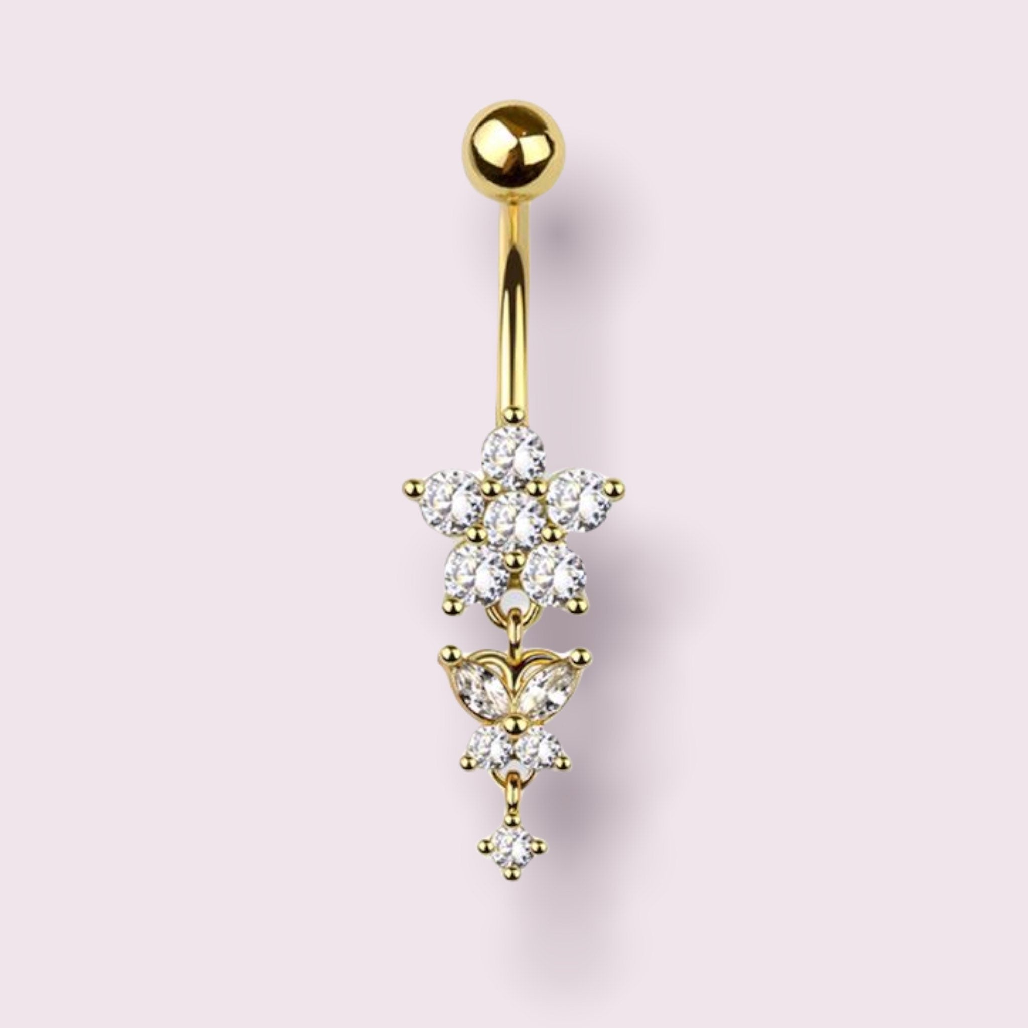 14G Gold Surgical steel flower with dangling butterfly belly button ring.