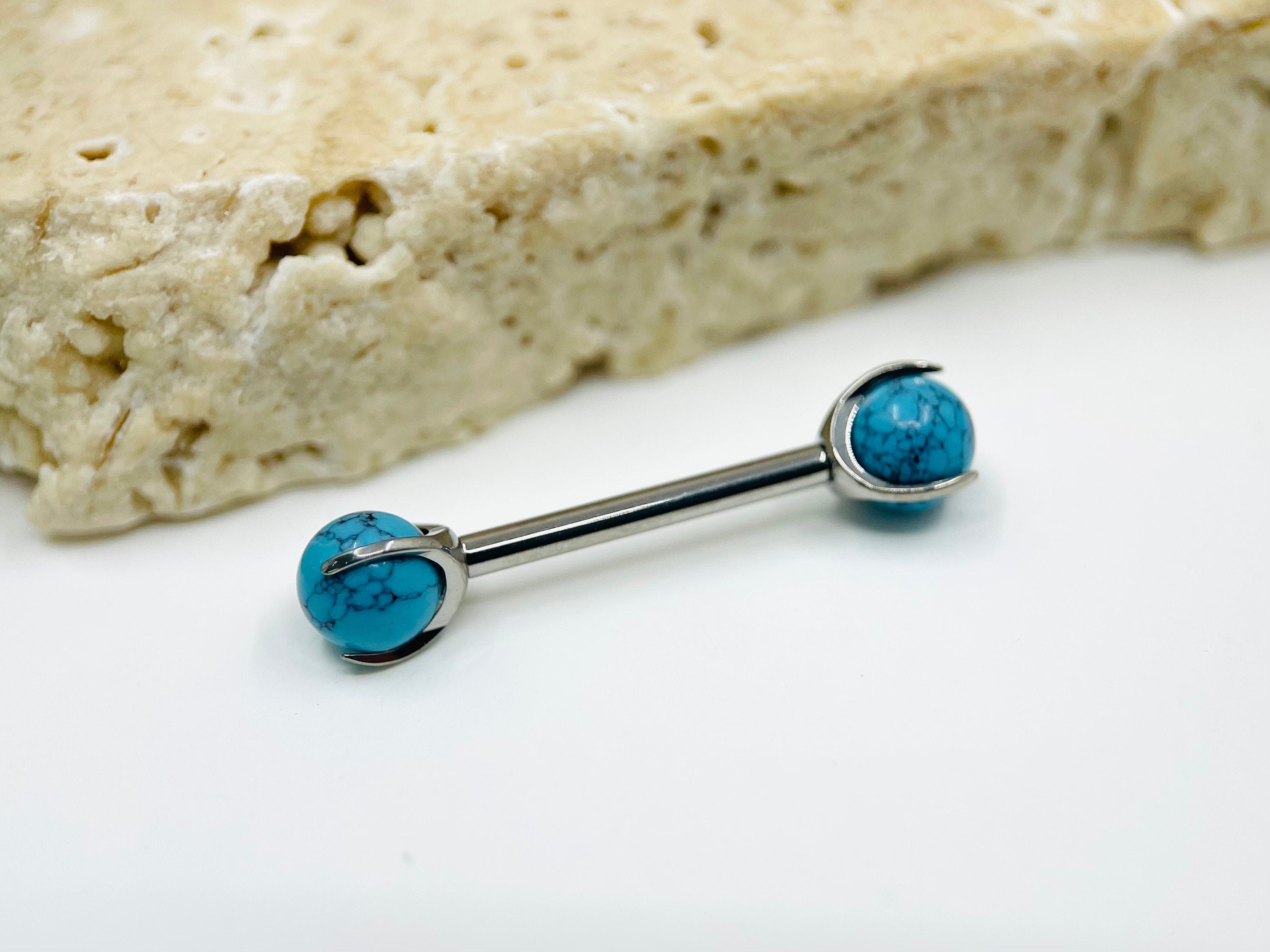 Turquoise stone titanium nipple barbell showcases the vibrant and captivating allure of turquoise gemstones in a modern and stylish design. The turquoise stones, with their unique blue and green hues reminiscent of tranquil waters, bring a refreshing and eye-catching element to the jewelry. The lightweight yet robust titanium barbell ensures both comfort and durability, making it suitable for everyday wear. This piece beautifully combines the natural beauty of turquoise with the sleekness of titanium, resulting in an accessory that's a harmonious blend of elegance and contemporary flair, perfect for expressing individuality.