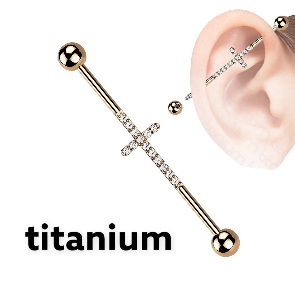 Beautiful and sleek piece of Implant grade titanium industrial barbell with sparkling cross in the center.