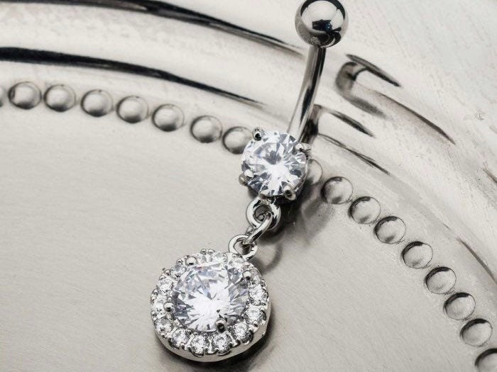 14 gauge surgical steel silver dangling clear gem charm belly button ring.