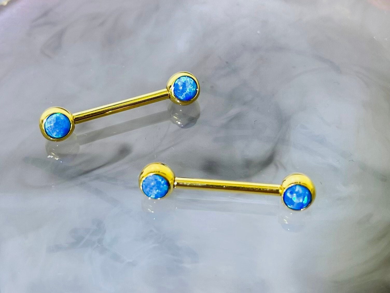 Set of dainty pink opal internally threaded surgical steel nipple barbells.