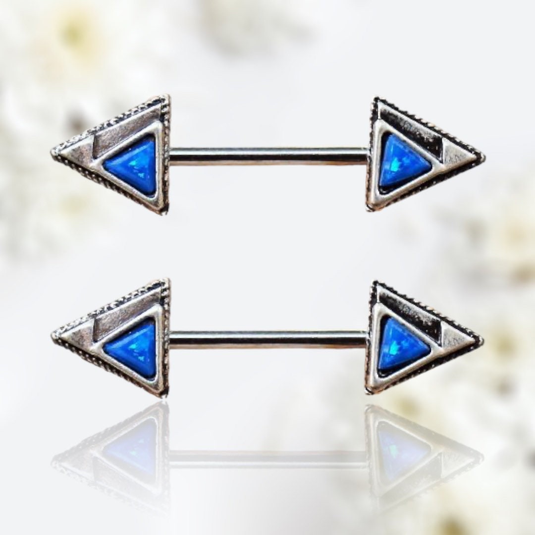 Pair of 14G Blue Opal Gem Triangle Ends Nipple Barbell