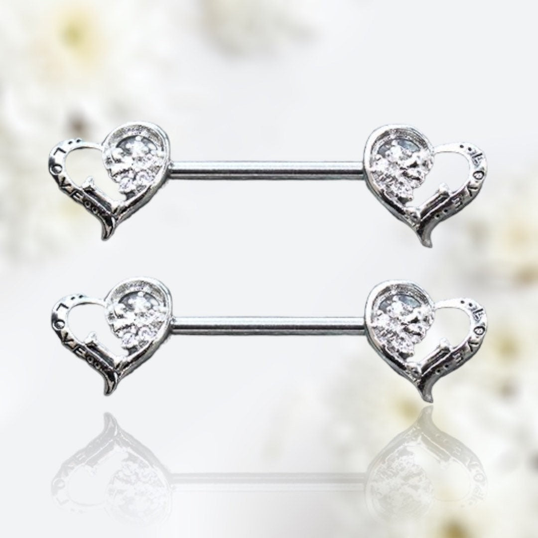 Pair of 14G Clear Gem Lovely Hearts Ends Nipple Barbell