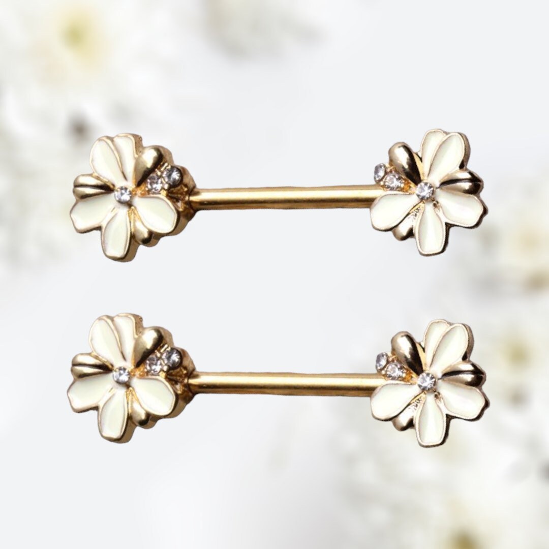 Pair of 14G Gold Clear Gems White Flowers Nipple Barbells