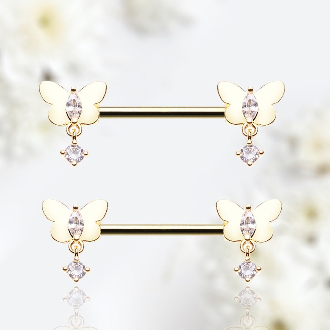 Set of dainty Butterly ends with dangling clear gem nipple barbells.